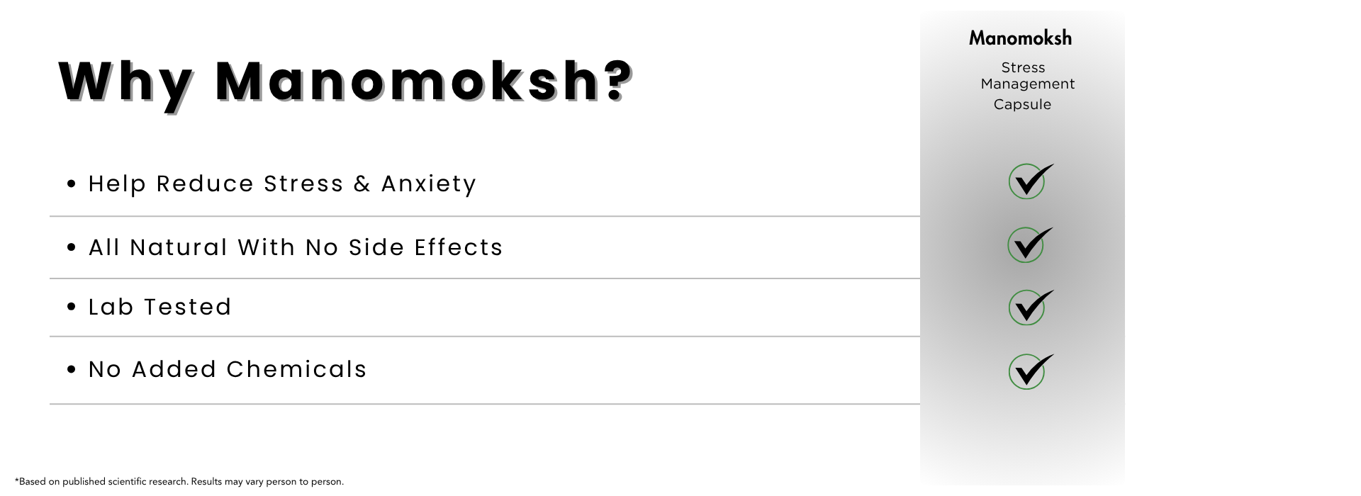 Relieves Stress & Anxiety with Manomoksh, a natural Ayurvedic blend designed to support mental wellness and stress relief. Enriched with Nagori Ashwagandha, Brahmi, Jatamansi, these powerful herbs work synergistically to reduce anxiety, improve focus, uplift mood, and promote restful sleep.