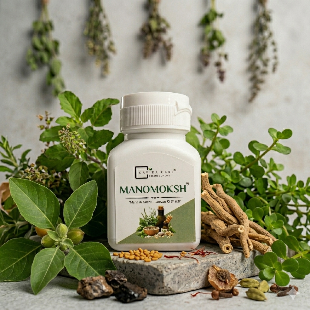 Relieves Stress & Anxiety with Manomoksh, a natural Ayurvedic blend designed to support mental wellness and stress relief. Enriched with Nagori Ashwagandha, Brahmi, Jatamansi, these powerful herbs work synergistically to reduce anxiety, improve focus, uplift mood, and promote restful sleep.