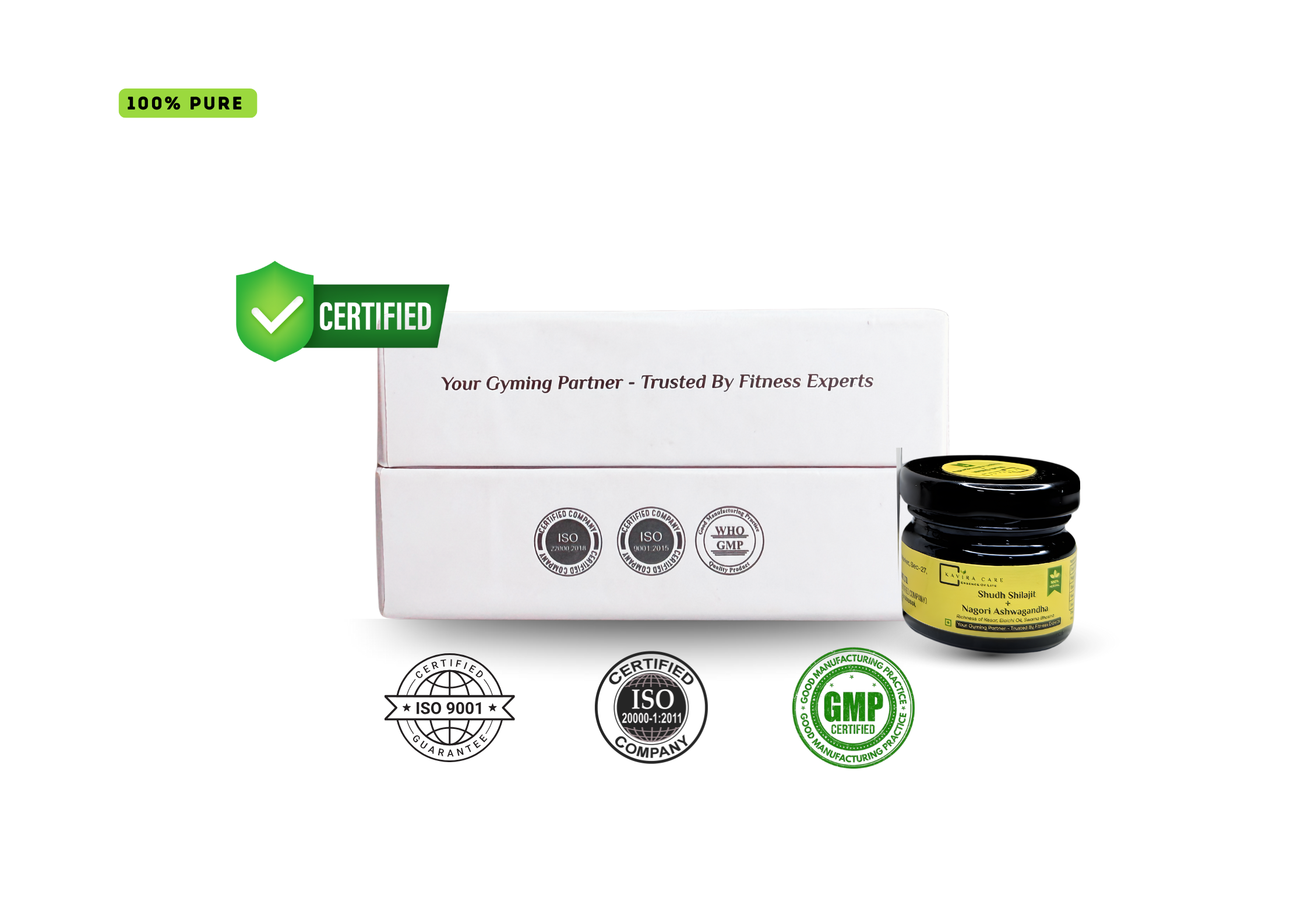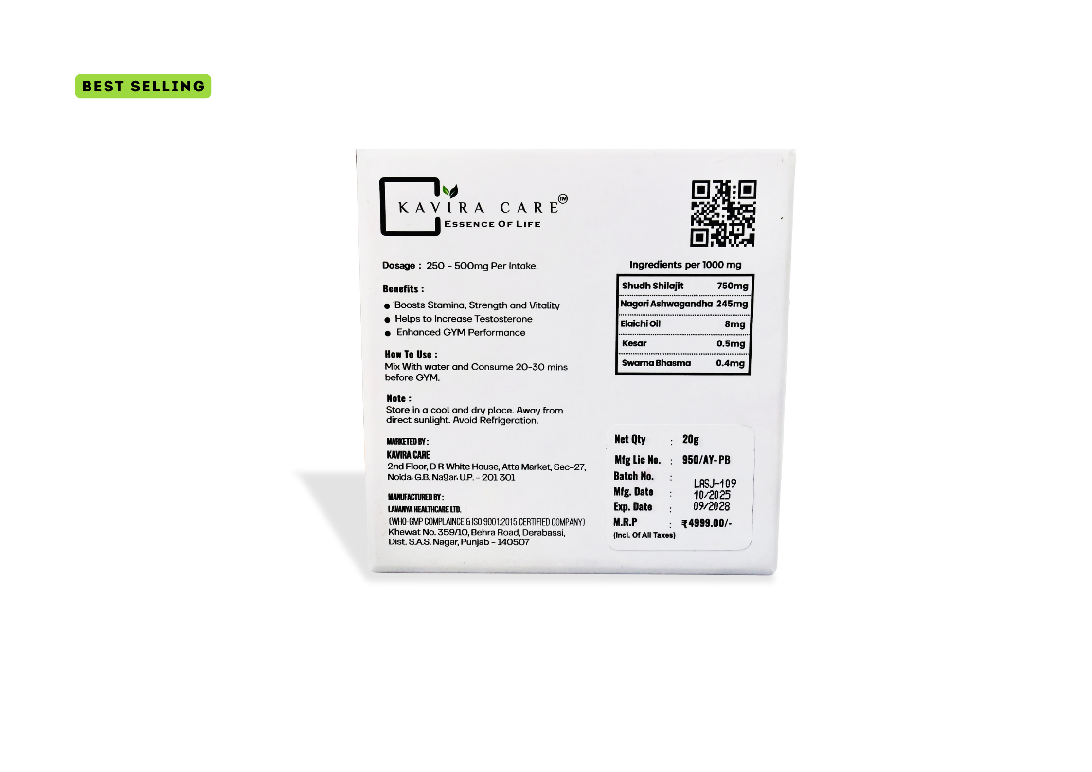 Ingredients – Shudh shilajit(750mg), Nagori Ashwagandha(245mg), Elaichi Oil(8mg), Kesar(0.5mg), Swarna Bhasma(0.4mg)